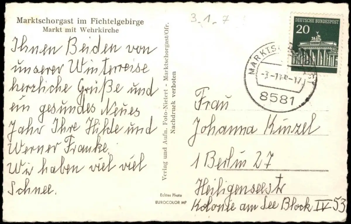 Ansichtskarte Marktschorgast Markt mit Wehrkirche VW Käfer 1969