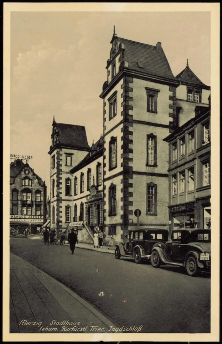 Ansichtskarte Merzig Stadthaus, Geschäfte 1933