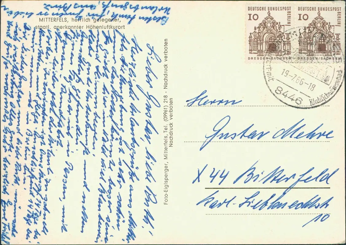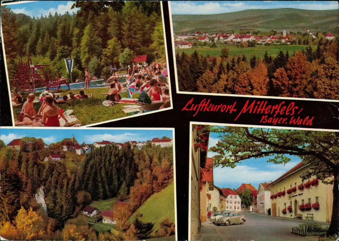 Ansichtskarte Mitterfels MB: Stadt, Schwimmbad, VW Käfer 1966