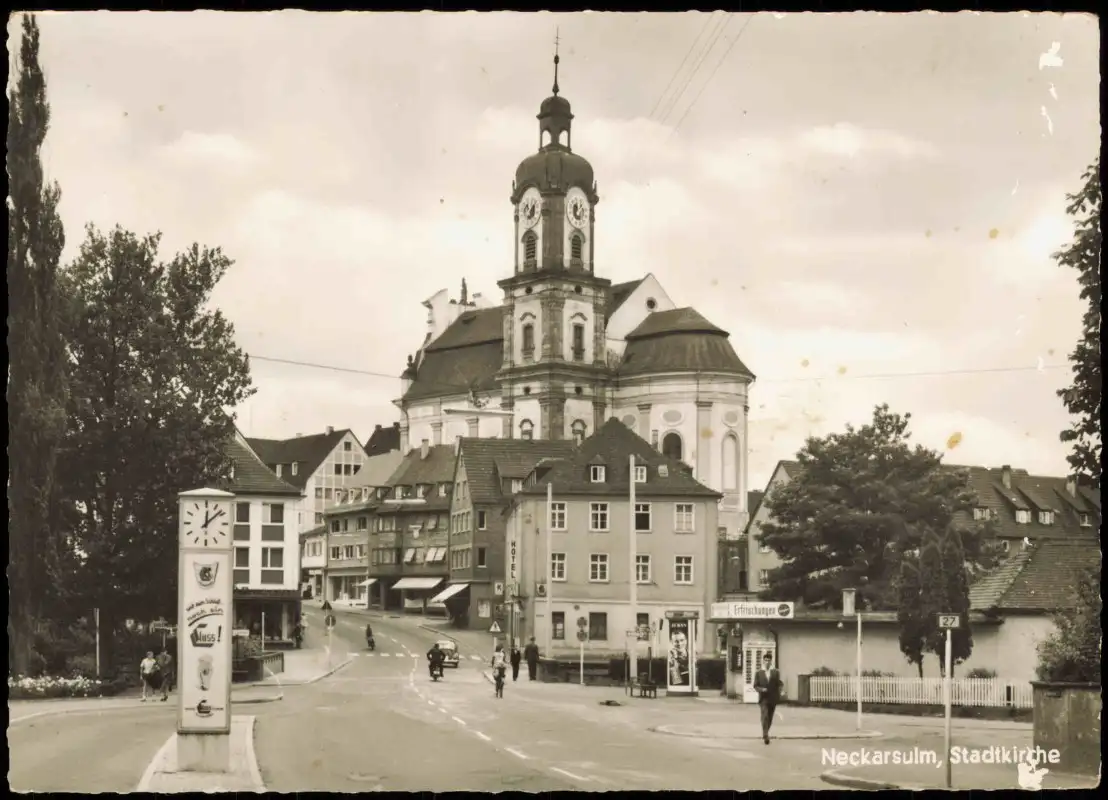 Ansichtskarte Neckarsulm Stadtpartie Uhr Kiosk und Stadtkirche 1968
