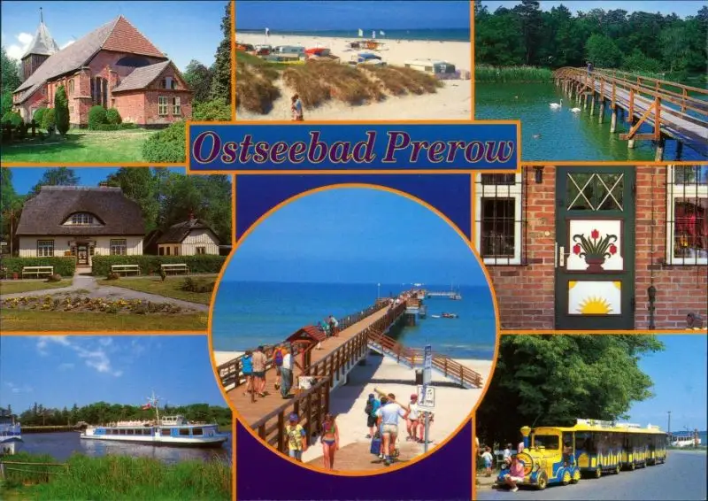 Ansichtskarte Prerow Kirche, Fischhaus, Strand, Seebrücke 1995