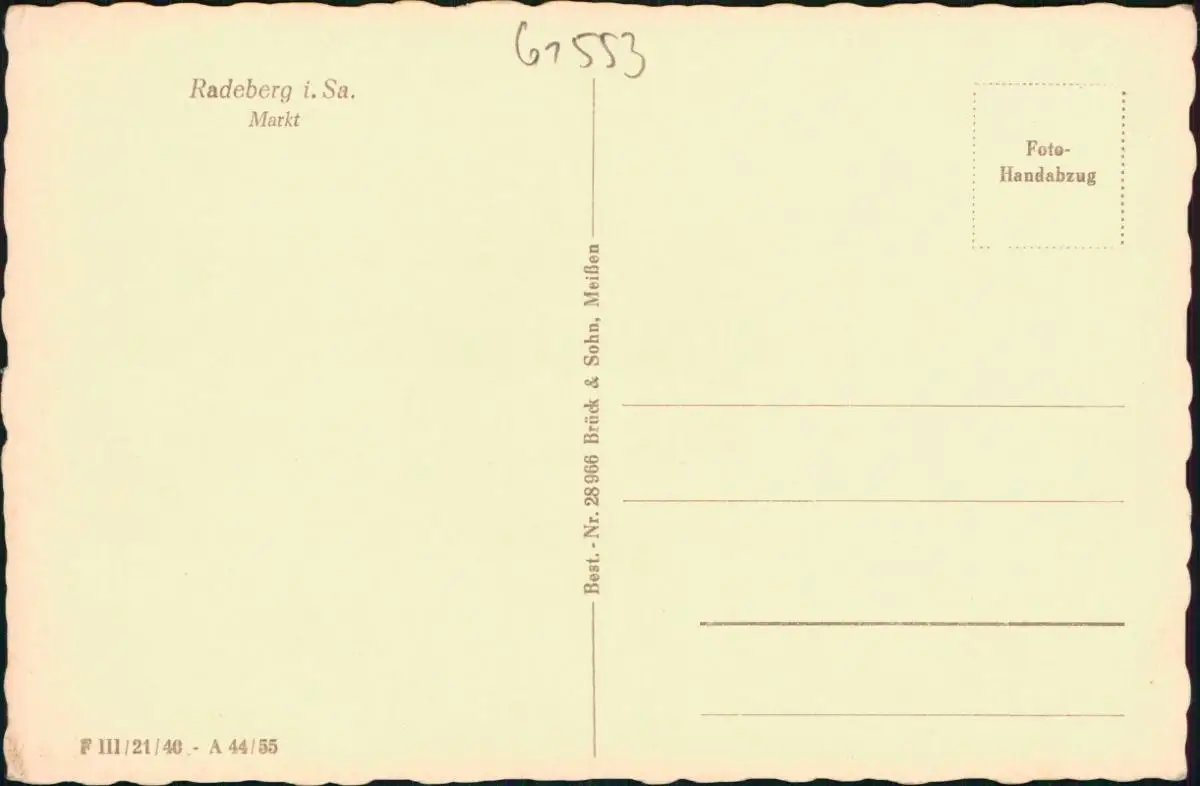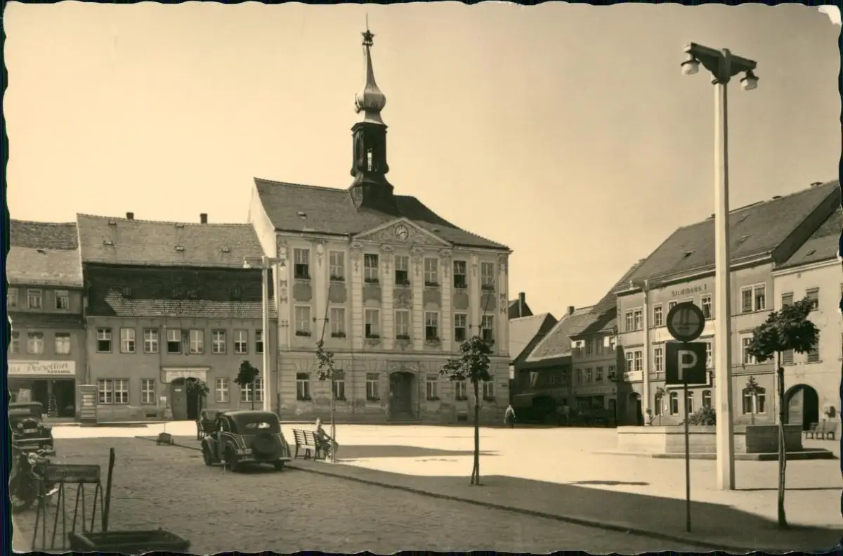 Ansichtskarte Radeberg Marktplatz, Geschäfte - Autos 1955