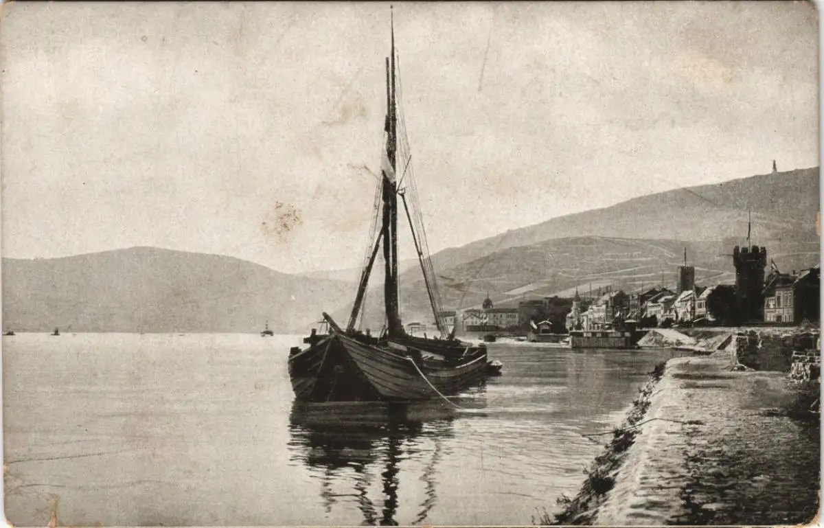 Ansichtskarte Rüdesheim (Rhein) Segelboot vor der Stadt 1909