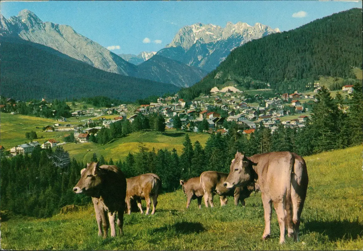 Ansichtskarte Seefeld Panorama-Ansicht, Alm-Motiv gegen Karwendelspitze 1981