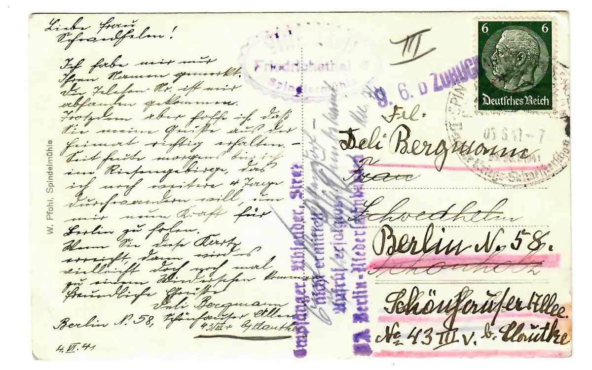 Ansichtskarte Spindelmühle 1941 nach Berlin, Empfänger nicht ermittelt