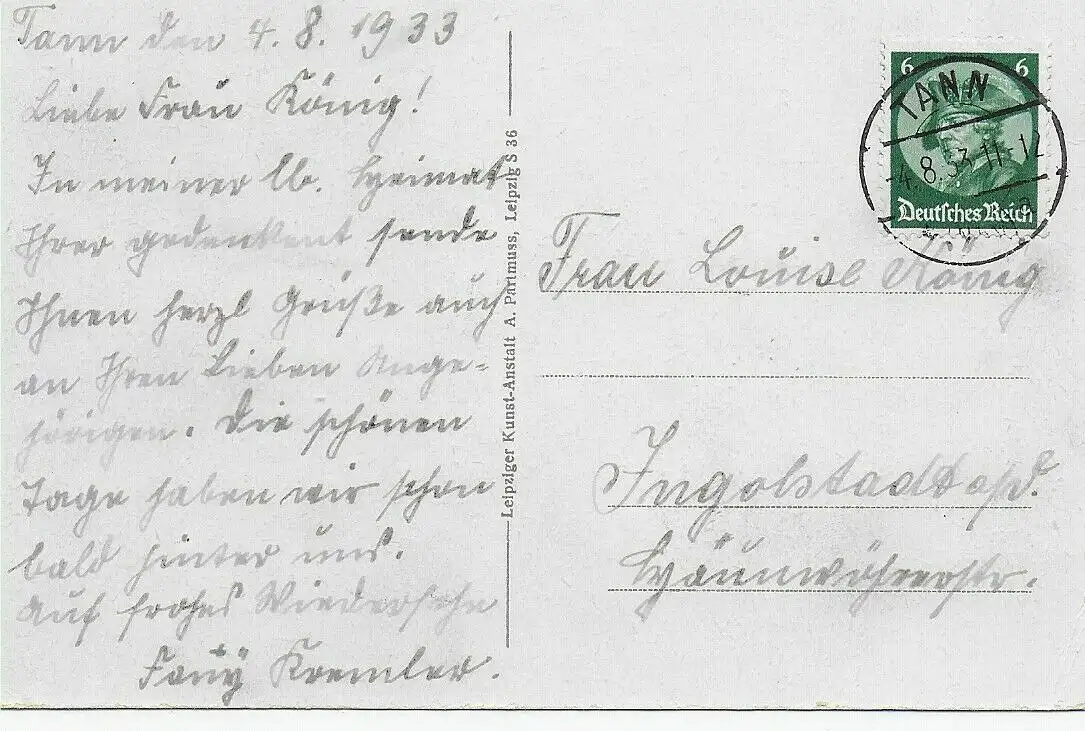 Ansichtskarte Tann (Ndb.) 1933 nach Ingoldstadt