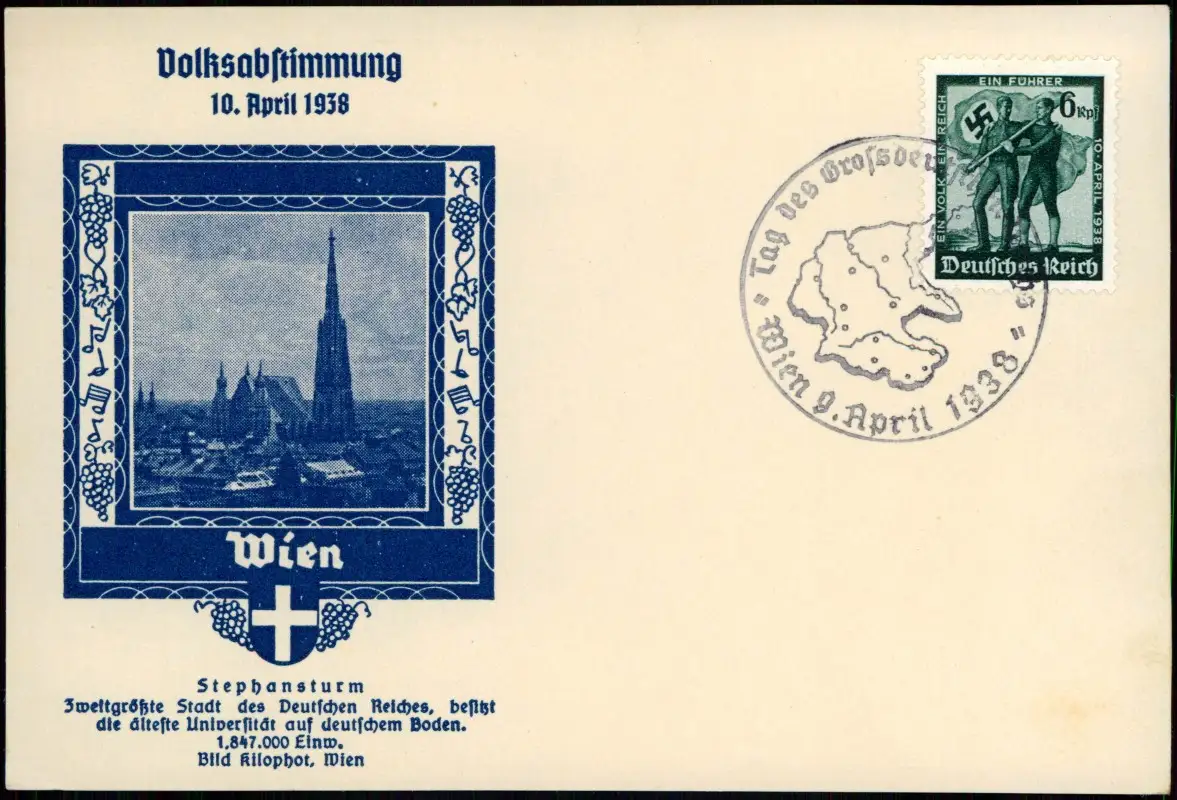 Ansichtskarte Wien Stephansturm zur Zeit der Volksabstimmung 1938 mit Propaganda-Sonderstempel