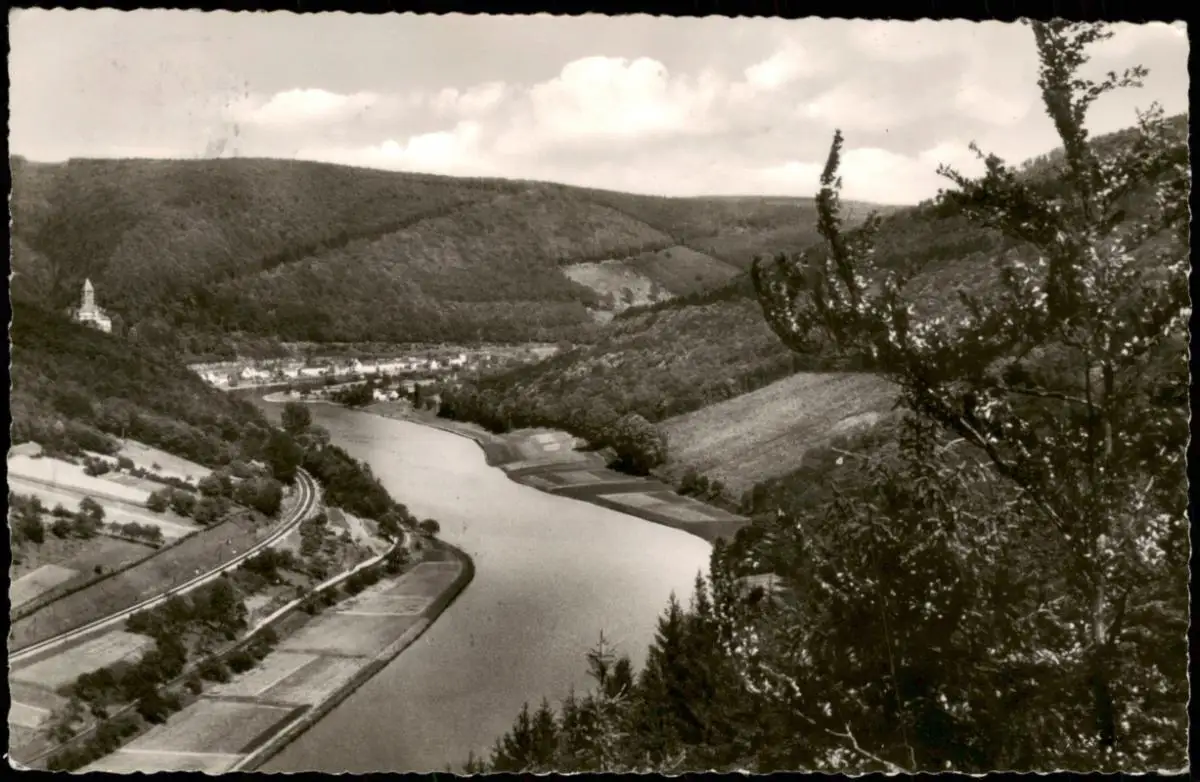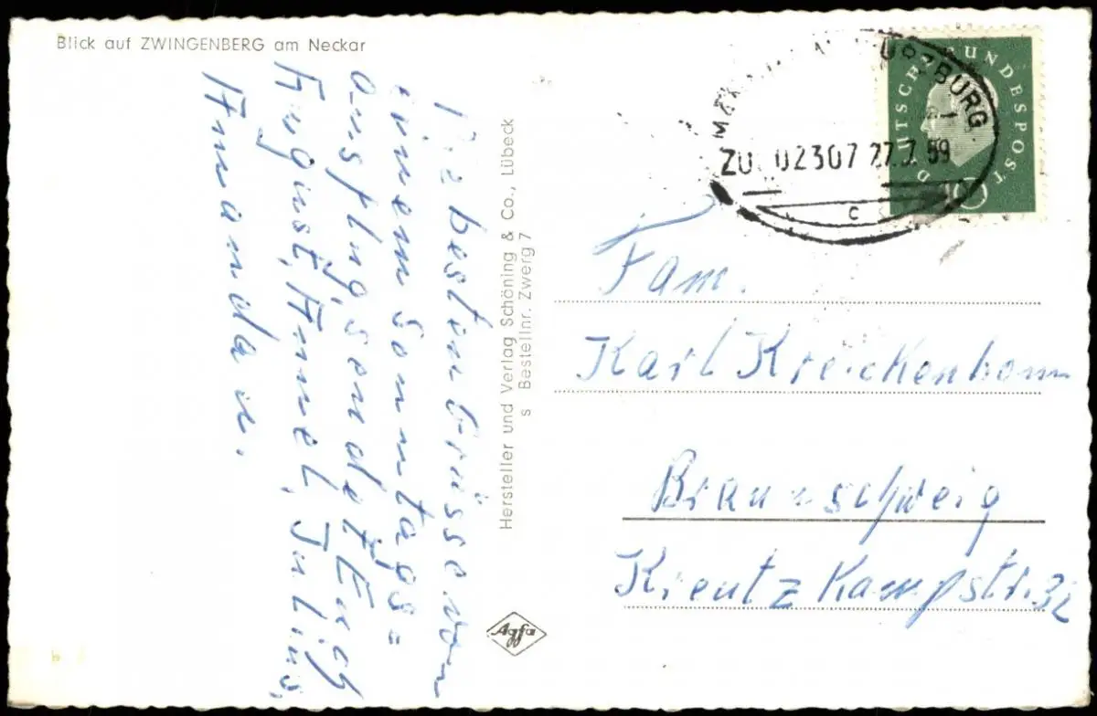 Ansichtskarte Zwingenberg (Bergstraße) Panorama-Ansicht 1959 Bahnpoststempel
