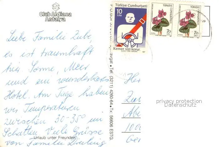 Antalya Club Aldiana Antalya postalisch gelaufen nach 1965 Erhaltung siehe scans [WerneD78] WernPID7