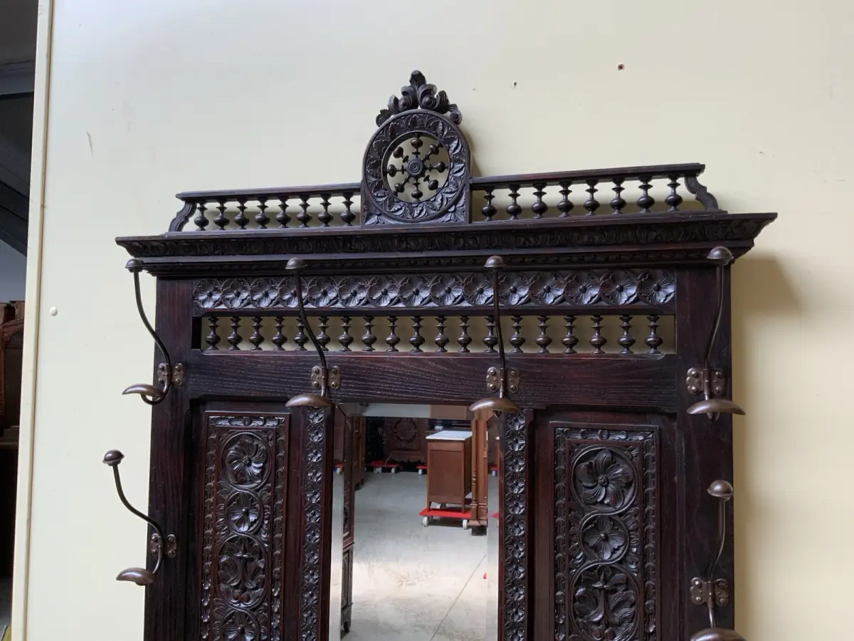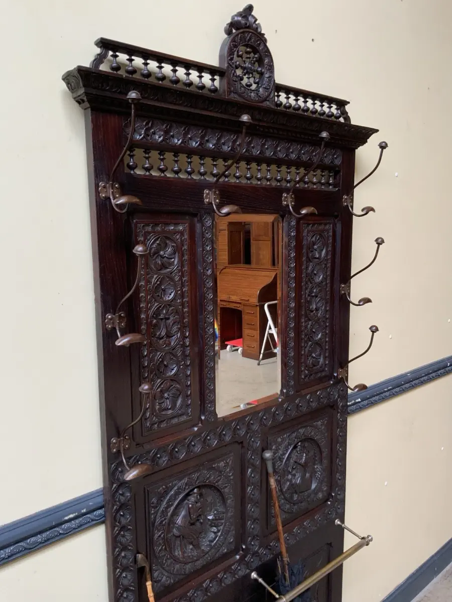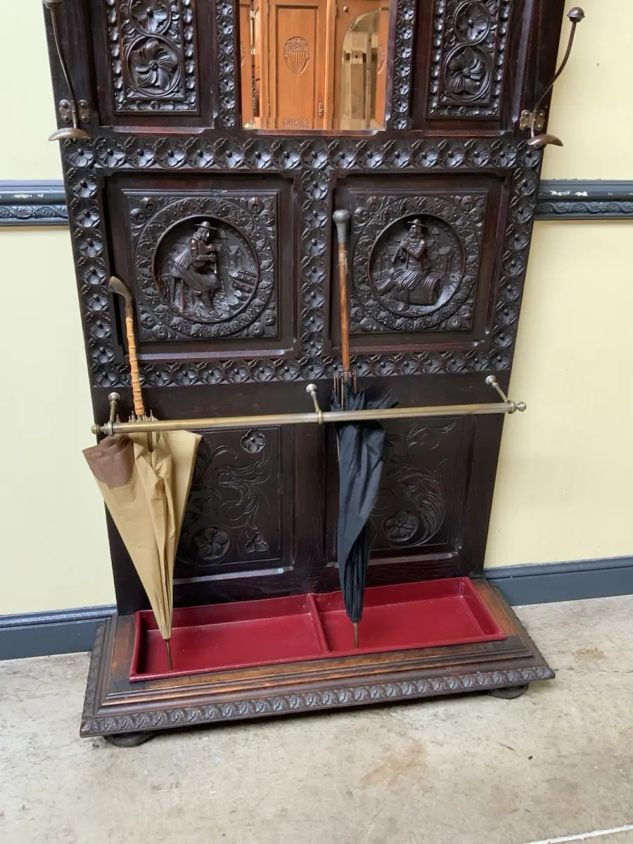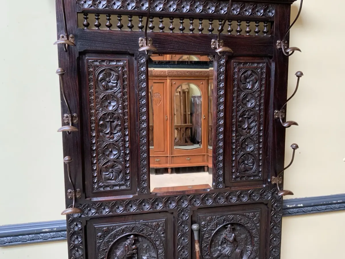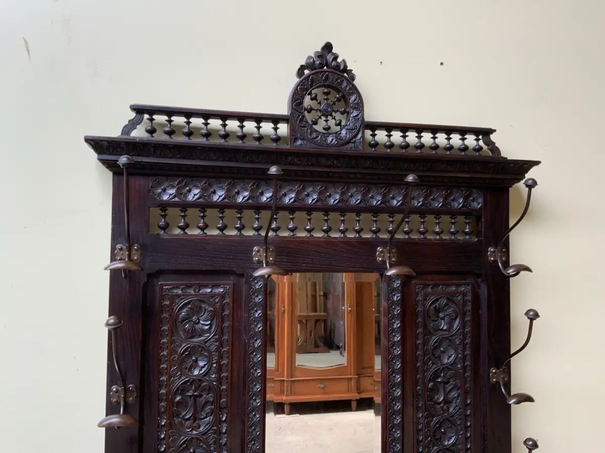 Ausst. u. Besonderheiten: allerbeste Qualität, super Patina, Schirmständer, schöne Mantelhaken, Spiegel mit Facettenschliff, sensationelle Schnitzereien,