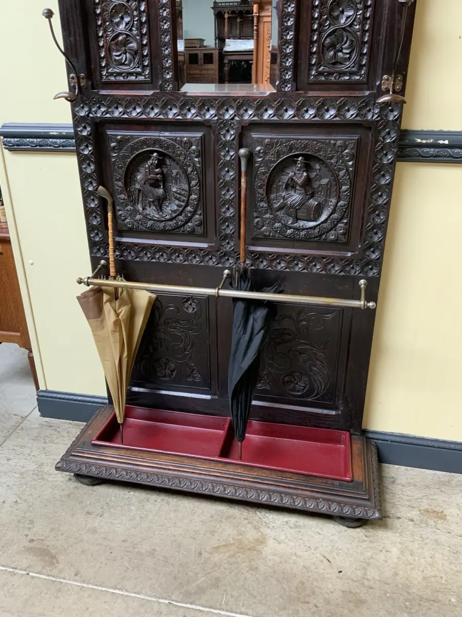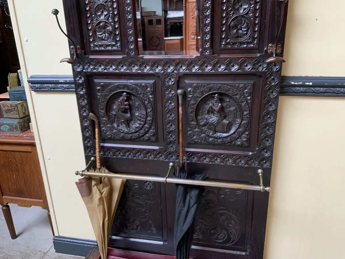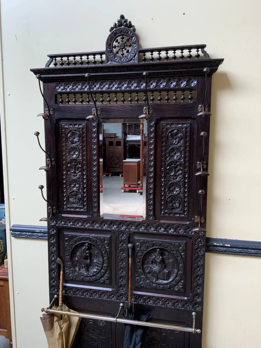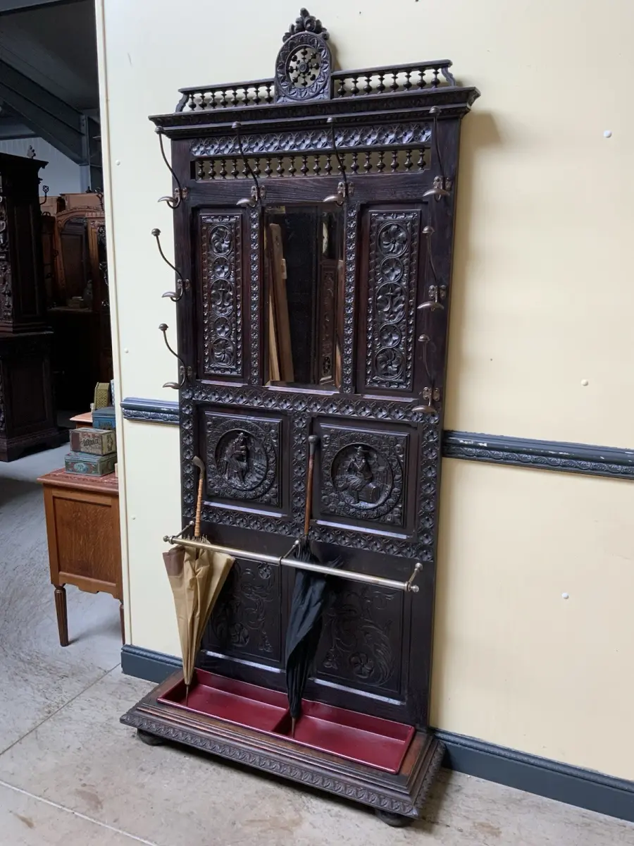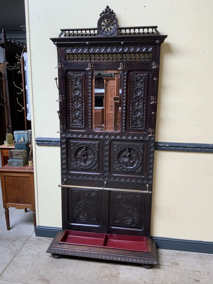 Ausst. u. Besonderheiten: allerbeste Qualität, super Patina, Schirmständer, schöne Mantelhaken, Spiegel mit Facettenschliff, sensationelle Schnitzereien,