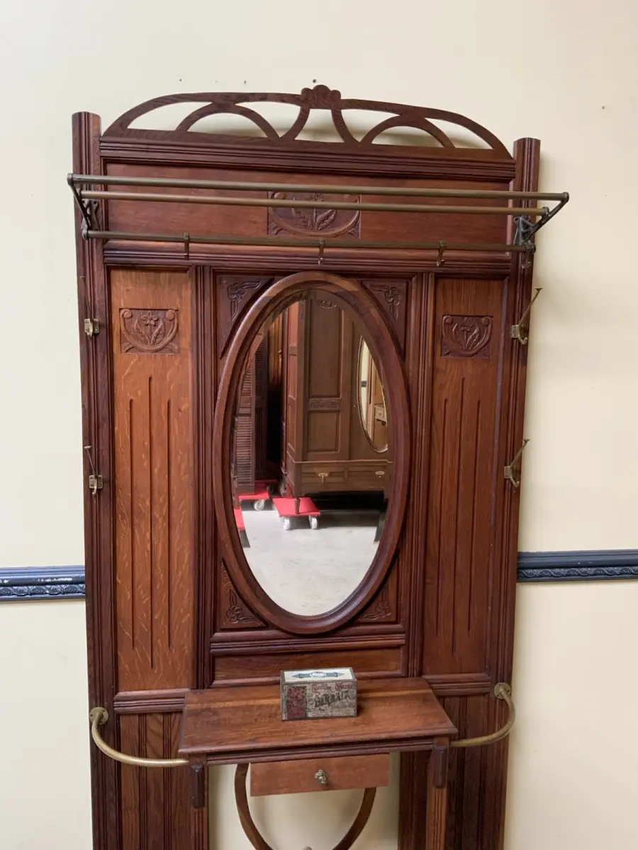 Ausst. u. Besonderheiten: allerbeste Qualität, super Patina, innen sauber, Spiegel mit Facettenschliff, Schirmständer, klasse Mantelhaken, Schub, traumhaft schöne Schnitzereien, Hutablage, klasse Bekrönung,