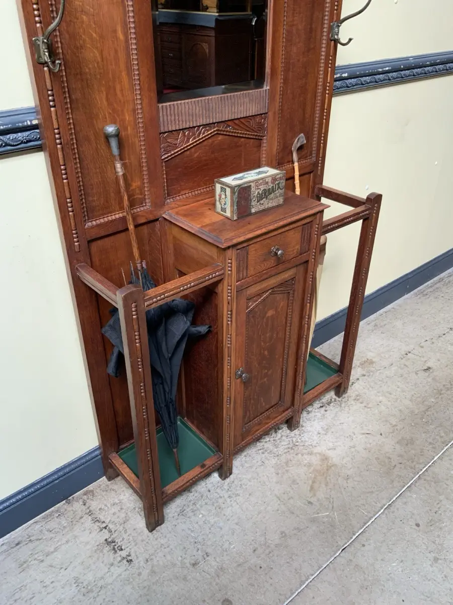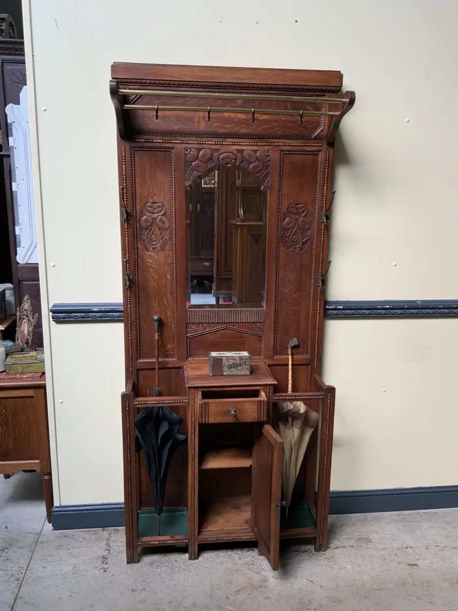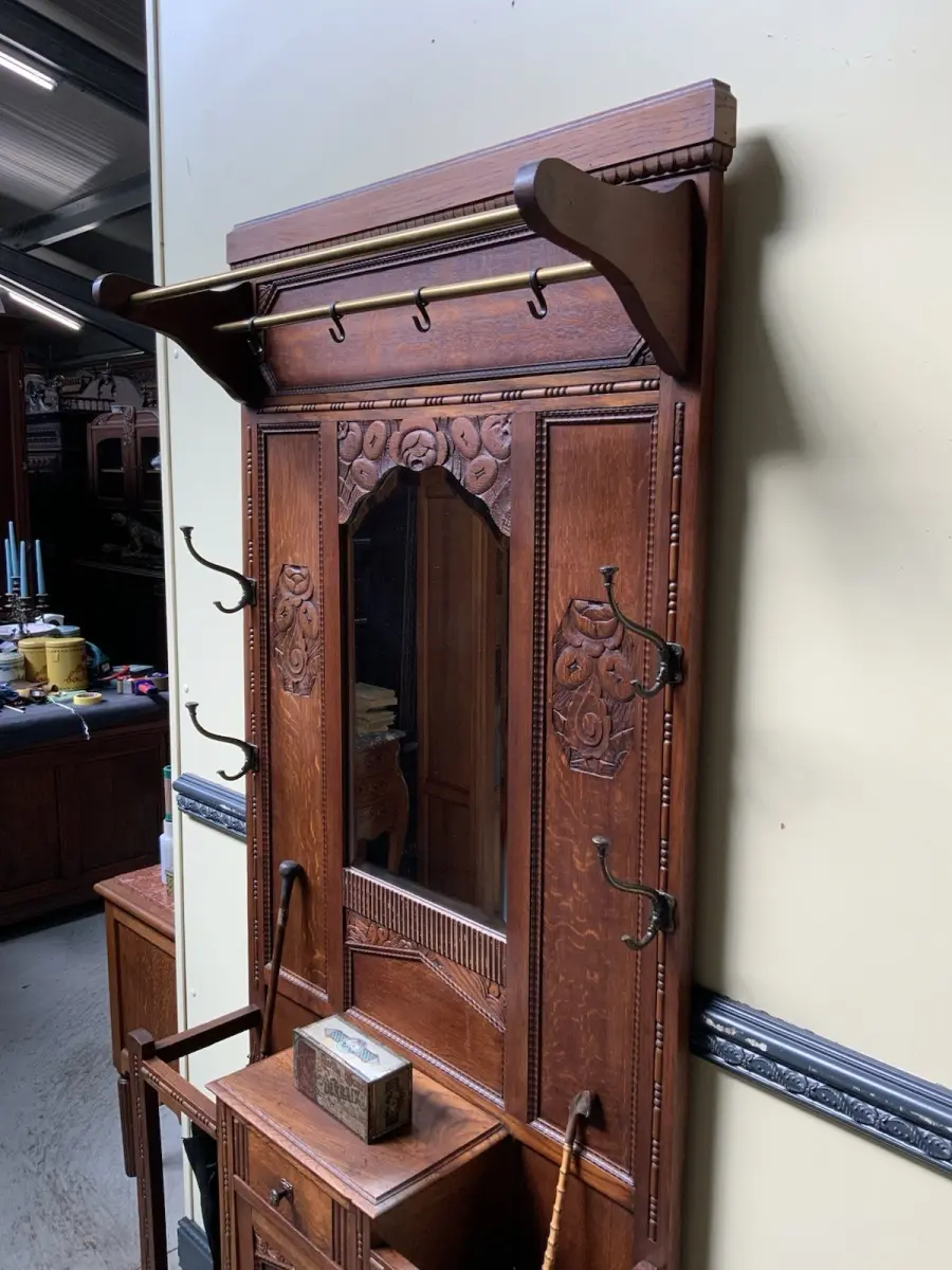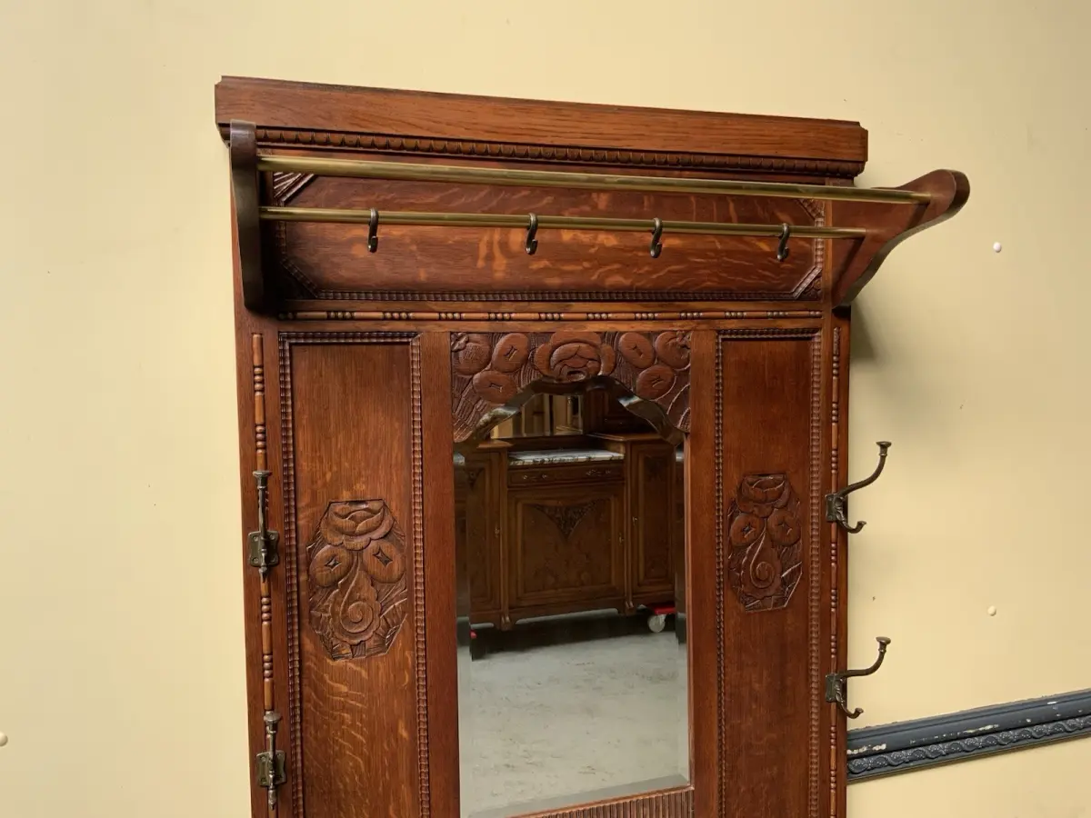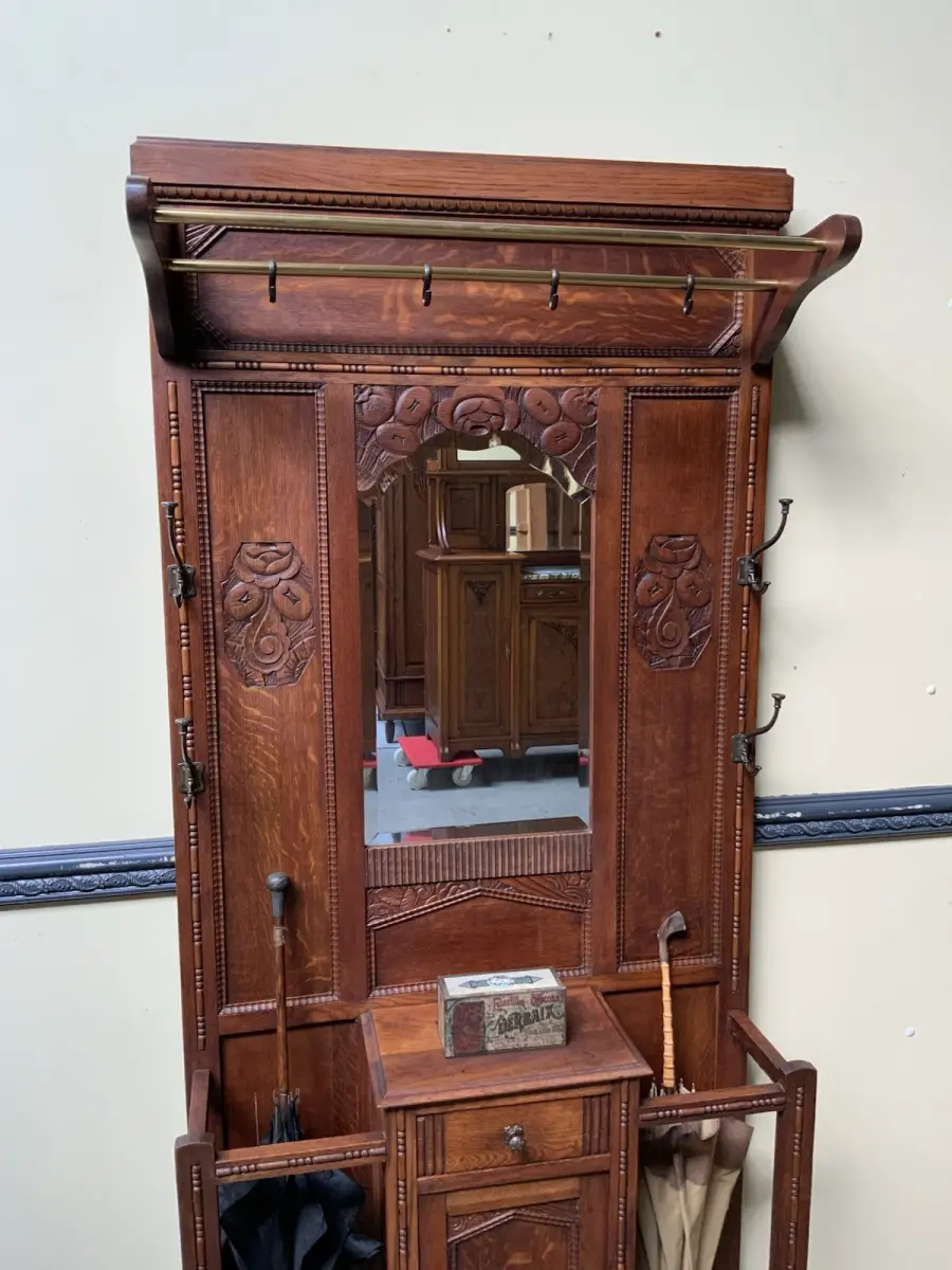 Ausst. u. Besonderheiten: allerbeste Qualität, super Patina, innen sauber, Spiegel mit Facettenschliff, Schirmständer, klasse Mantelhaken, Schub, Schrank, traumhaft schöne Schnitzereien, Hutablage,