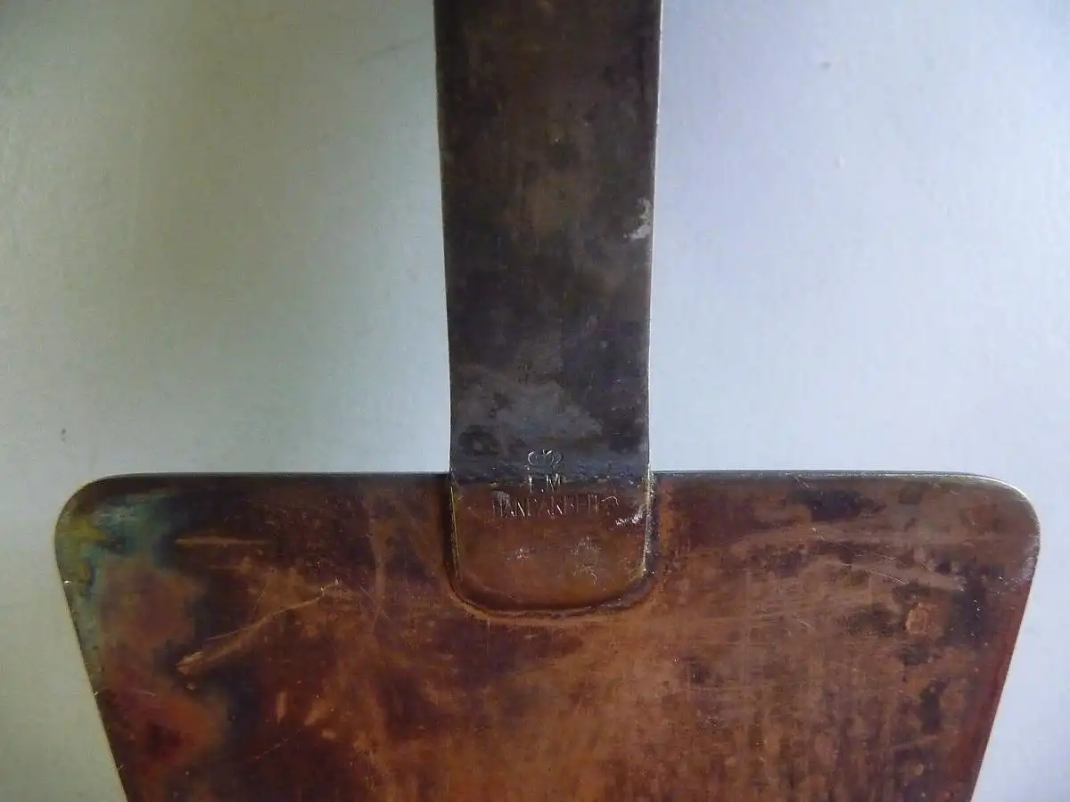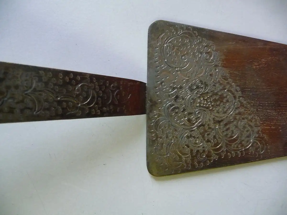 Alter Tortengheber mit Relief-Verzierungen Am Griffansatz Gravur "EM / Handarbeit" Länge ca. 20 cm Zustand: stark angelaufen, nachgedunkelt. Zustand vgl. auch Fotos