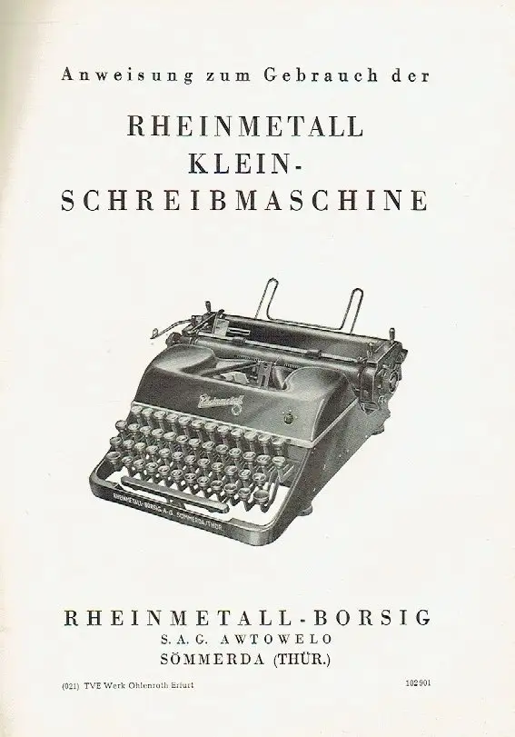 guter bis sehr guter Zustand, geringe Gebrauchs- und Alterungsspuren: Umschlag etwas vergilbt und leicht verschmutzt, aber Seiten sauber und ordentlich - etwas Klammerrost, zur Datierung: das Rheinmetall-Borsig-Werk in Sömmerda gehörte nur vom 1. Januar 1950 bis zum 2. Juni 1952 zur Sowjetischen AG Awtowelo - Bezeichnung der einzelnen Schreibmaschinenorgane - Allgemeine Hinweise - Abnehmen der Haube - Auflegen des Farbbandes - Farbbandeinrichtung - Einführen des Papiers - Randeinstellung - Zeilenschaltung - StechwaIze - Umschaltung - Rücktaste - ZwiSchenraumtaste - Tottaste - Setztabulator - Tastenanschlagregler - Abnehmen des Wagens - Herausnehmen der Typenhebel - Praktische Ratschläge für Instandhaltung, Softcover, ca. 14,5 x 20,5, 16 Seiten mit 9 Bildern