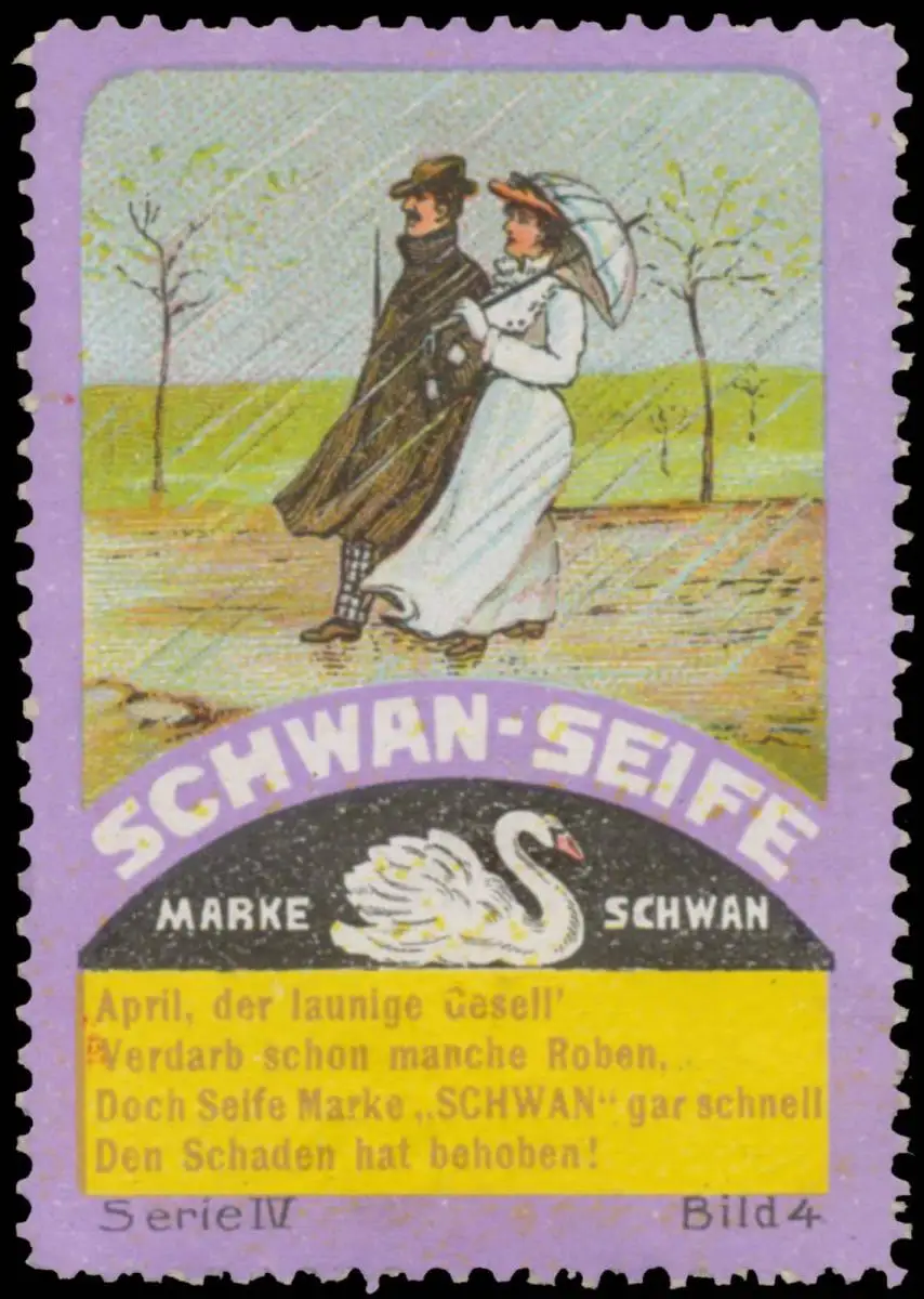 verdarb schon manche Roben, doch Seife Marke - Schwan - gar schnell den Schaden hat behoben ! Serie IV, Bild : 4, Rückseite mit Reklame für das Seifix Sammelmarken - Album, Regenschirm, Variante 2, Größe/Zustand: 5x4 , guter Zustand, Original alte Reklamemarke die seinerzeit für die Werbung benutzt wurde