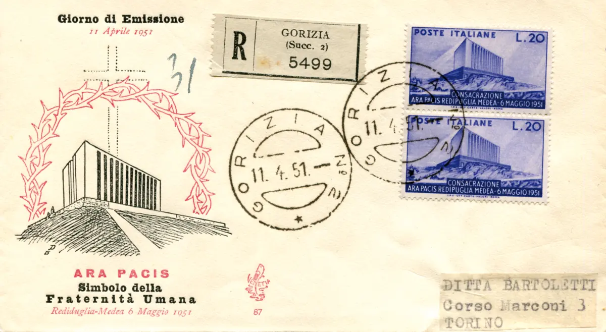Ara Pacis Nr. 656 Paar auf Einschreiben für Turin mit Ankunftsstornierung Cod. 354/16
