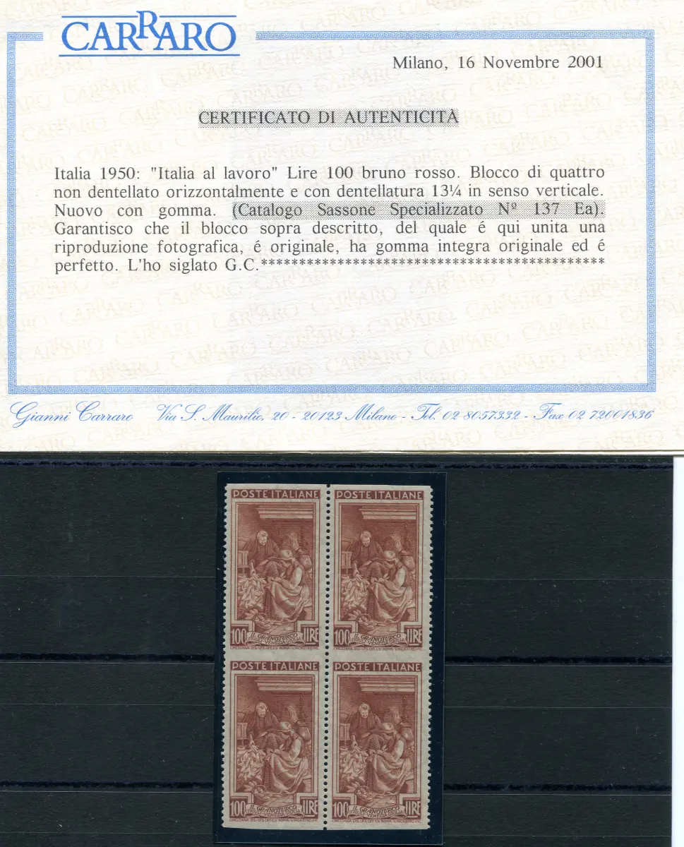 MNH Vollgummi - Arbeit L. 100 n. 651/Iig Viererblock waagerecht ungezähnt (Sass. spec. Nr. 137 Ea) - Selten - Zert. Carraro - Kat. euro 1.700 Cod. 466/16