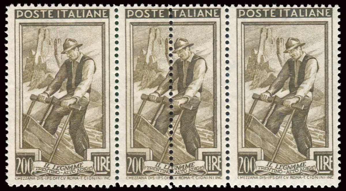 Arbeit Lire 200 Sorten zusätzliche Verzahnung in der Mitte Vollgummi MNH - Arbeit Lire 200 Nr. 652pa horizontaler Streifen von drei Exemplaren, eines mit zusätzlicher vertikaler Verzahnung in der Mitte - Selten - Kat. euro 600+ Cod. 417/15