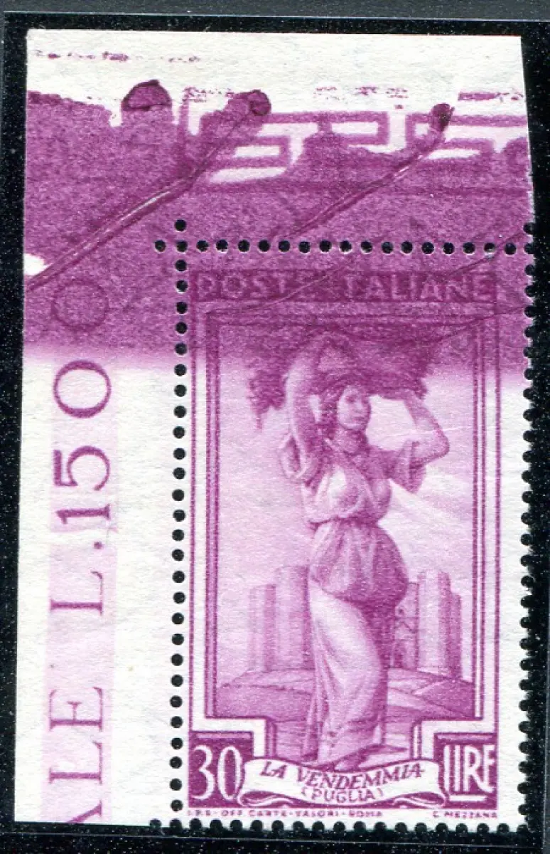 Vollgummi - Arbeit Lire 30 Nr. 758 filigrane Sterne schönes Exemplar a. von f. mit breitem Farbband oben auf der Briefmarke durch übermäßige Tinte - Auffällig
