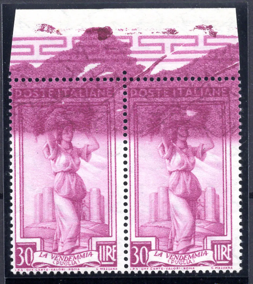 Arbeit Lire 30 Sorten breite Farbpalette Vollgummi - Arbeit Lire 30 Nr. 758 filigrane Sterne Paar mit großem Farbbereich oben auf der Briefmarke durch übermäßige Tinte - Auffällige Cod. 588/13
