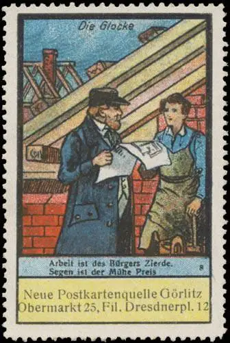 Serie: Die Glocke. Neue Postkartenquelle in Görlitz, Bruno Hanzig, Ansichtskarten und Schreibwaren, Obermarkt 25, Filiale: Dresdner Platz 12, Größe/Zustand: 6x4 , guter Zustand, Original alte Reklamemarke die seinerzeit für die Werbung benutzt wurde