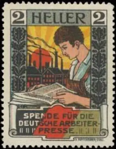 Spende für die deutsche Arbeiterpresse, Presse, Zeitung, Fabrikansicht, Größe/Zustand: 4x3 , guter Zustand, Original alte Reklamemarke die seinerzeit für die Werbung benutzt wurde