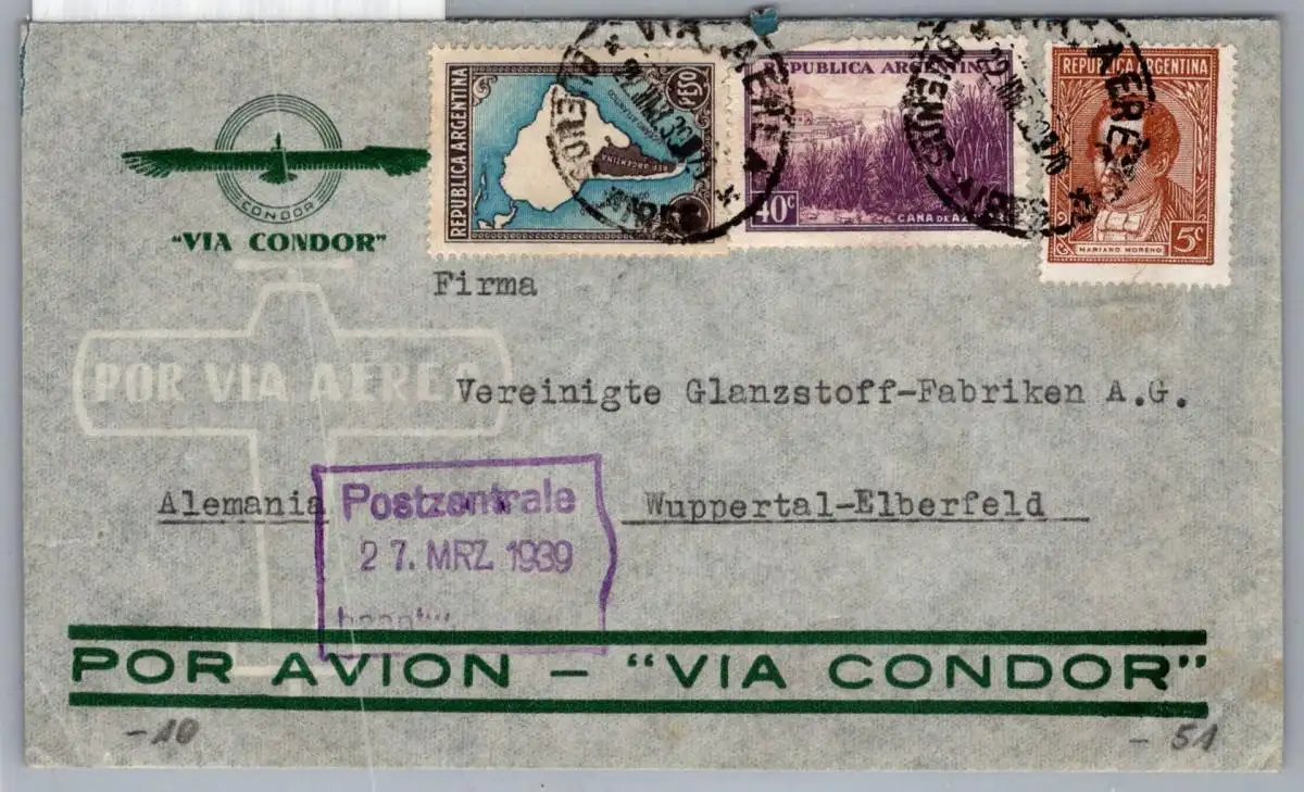 Luftpostbrief aus Buenos Aires am 22.3.1939 nach Wuppertal Elberfeld gelaufen.