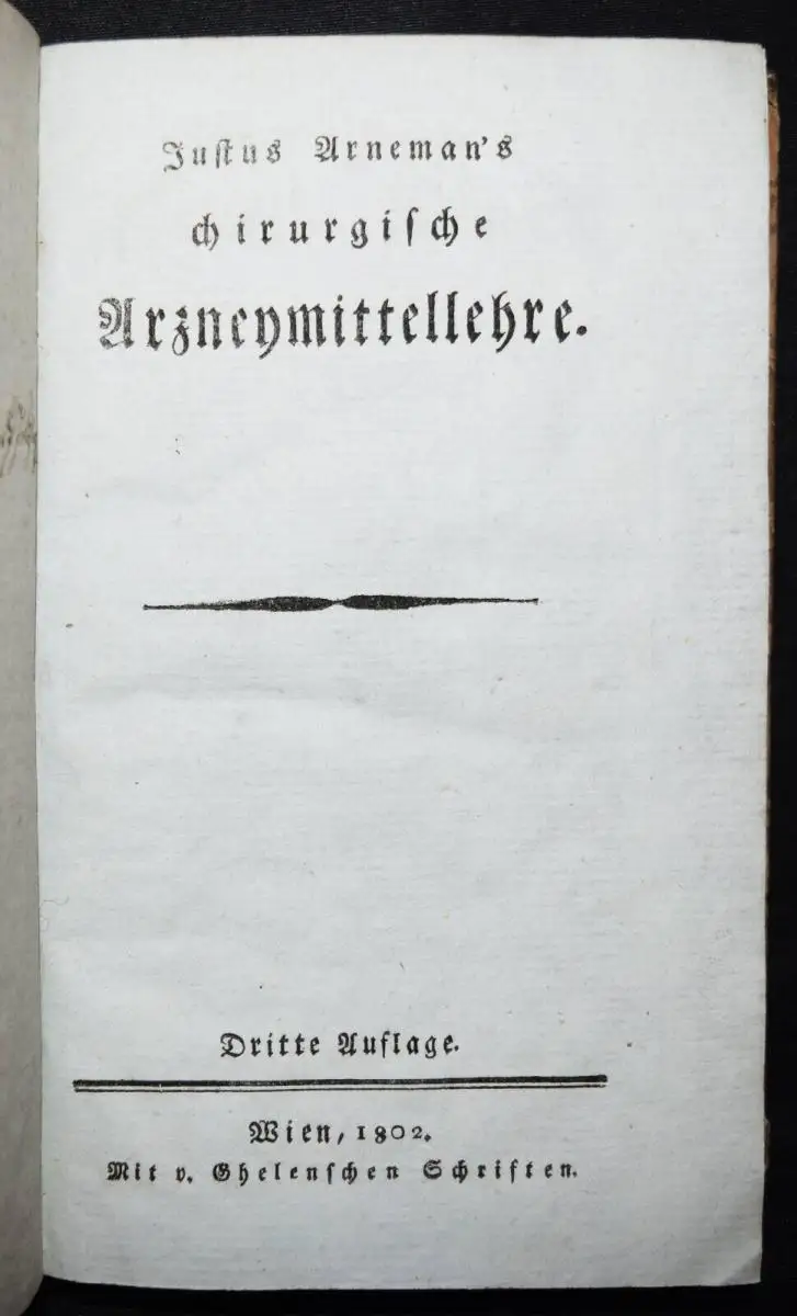 Arnemann, Justus. Chirurgische Arzneimittellehre. 3. Aufl. Wien, Gehlen 1802. 8°. VIII, 198 S., [7] Bl. Pbd. d. Zt. mit goldgepr. Rückenschild.