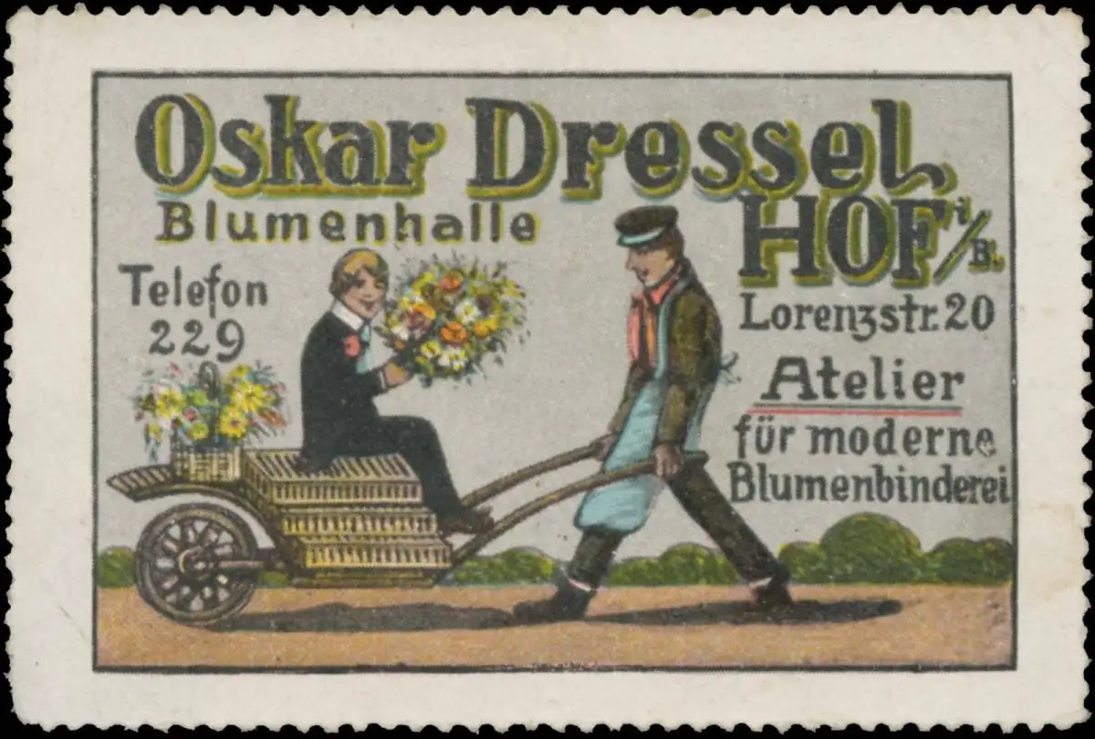 Blumenhalle, Lorenzstraße 20, Größe/Zustand: 4x7 , guter Zustand, Original alte Reklamemarke die seinerzeit für die Werbung benutzt wurde