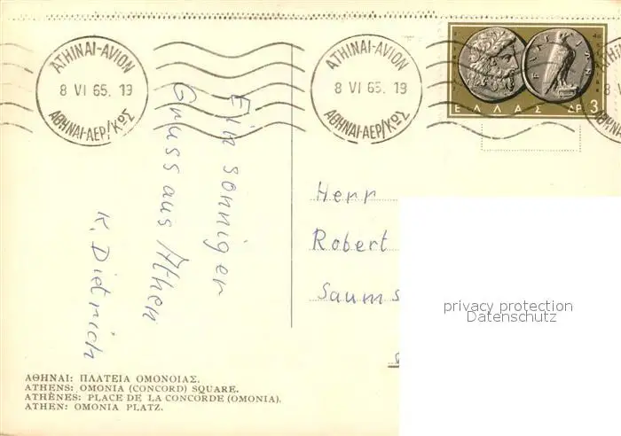 Athenes_Athen Omonia Platz Athenes Athen postalisch gelaufen 1965 Erhaltung siehe scans [FriedD77] Frierer