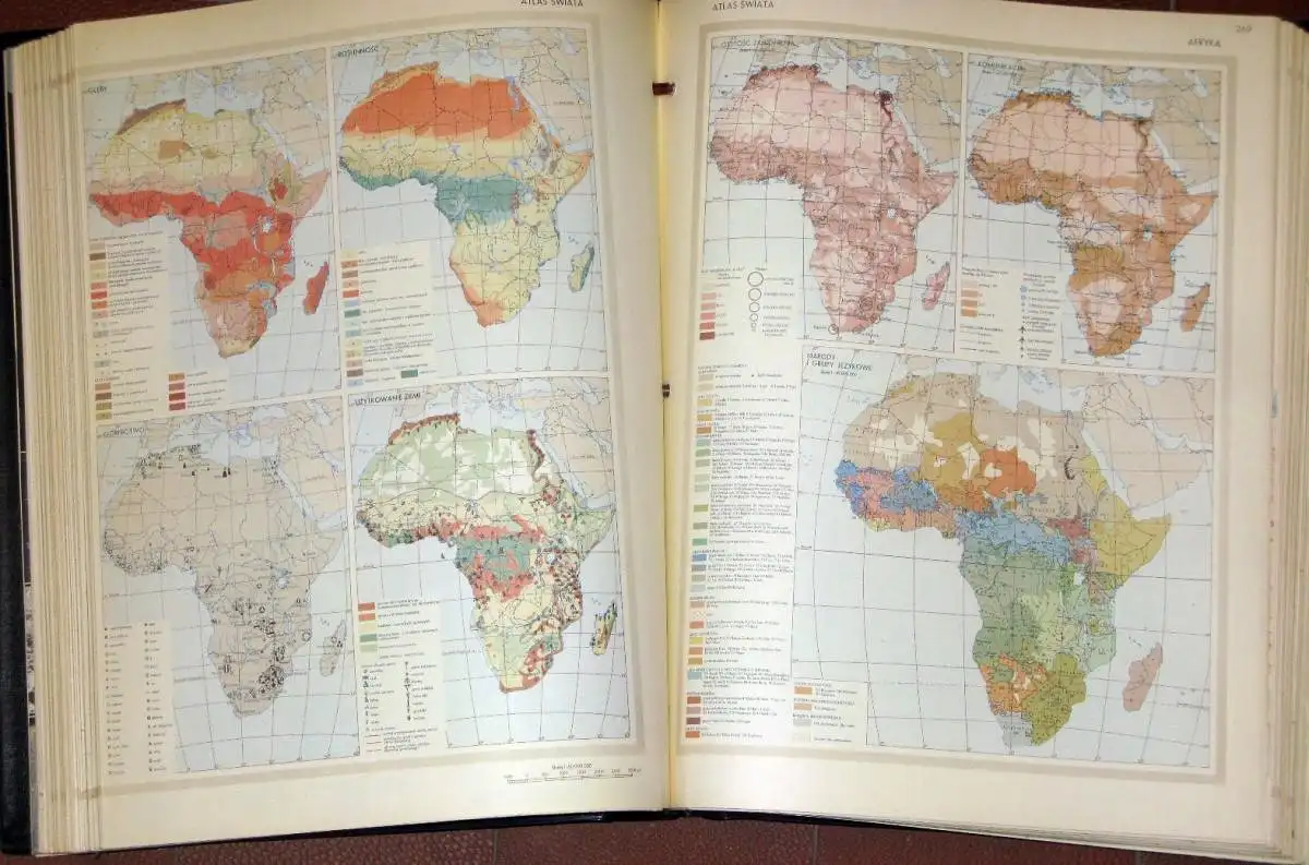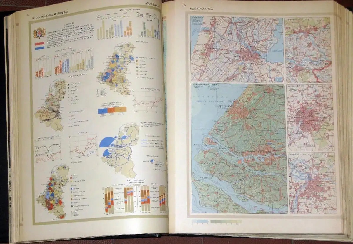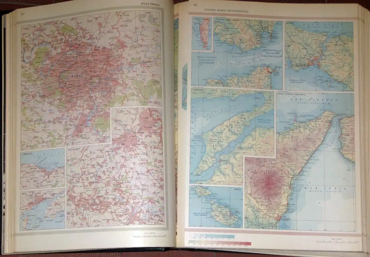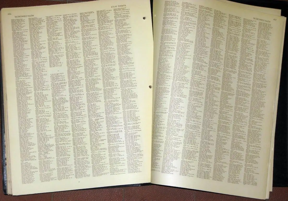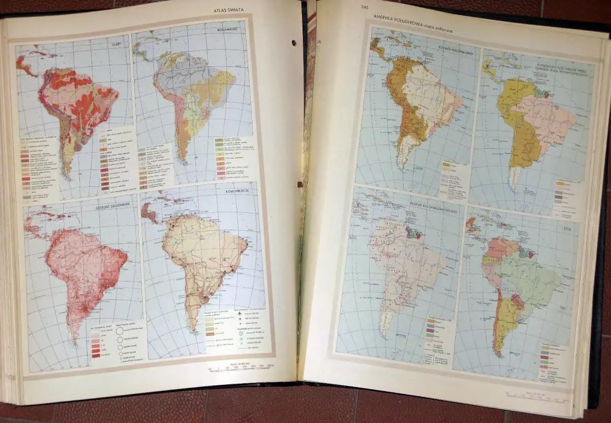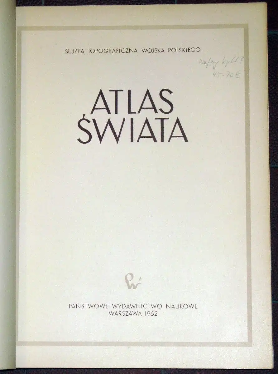 noch sehr guter Zustand, geringe Gebrauchs- und Alterungsspuren: 2 der 3 Schrauben sind nur noch zur Hälfte vorhanden, sie können also nicht mehr verschraubt werden, Atlas wird durch die komplette untere Schraube zusammen gehalten, die vorhandenen Schraubenteile der unvollständigen Schrauben sind die längeren Hülsen, so daß die Seiten auf diesen überwiegend aufgefädelt sind - Seiten sauber und ordentlich, Sammelwerk, die einzelnen Teile (Seiten und Karten) erschienen von 1962-1968, herausgegeben vom Topografischen Dienst der polnischen Armee, hier in einer vollständigen Ausgabe, Kunstleder-Schraubdeckel-Ordner mit loser-Blatt-Sammlung, ca. 33 x 41, VIII + 523 Seiten, davon ca. 400 Karten auf Tafeln