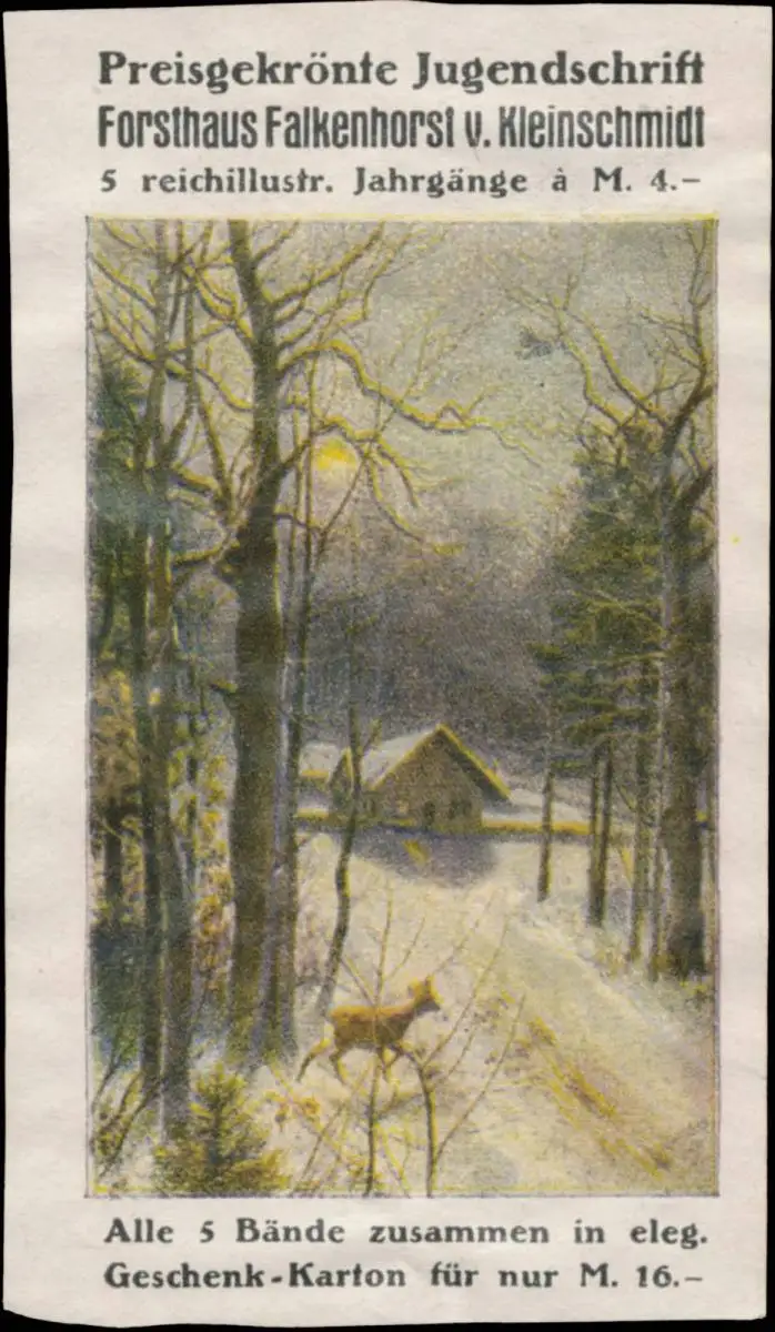 Forsthaus Falkenhorst v. Kleinschmidt, Preisgekrönte Jugendschrift, Jagd, Größe/Zustand: 8x4 , beschnitten, Rückseite fleckig sonst guter Zustand, Original alte Reklamemarke die seinerzeit für die Werbung benutzt wurde