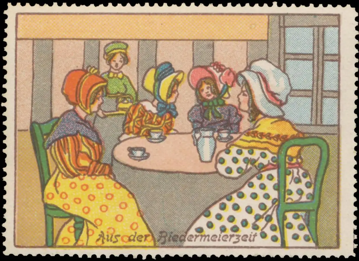 Biedermeier, Frauen am Kaffeetisch, Größe/Zustand: 5x7 , guter Zustand, Original alte Reklamemarke die seinerzeit für die Werbung benutzt wurde