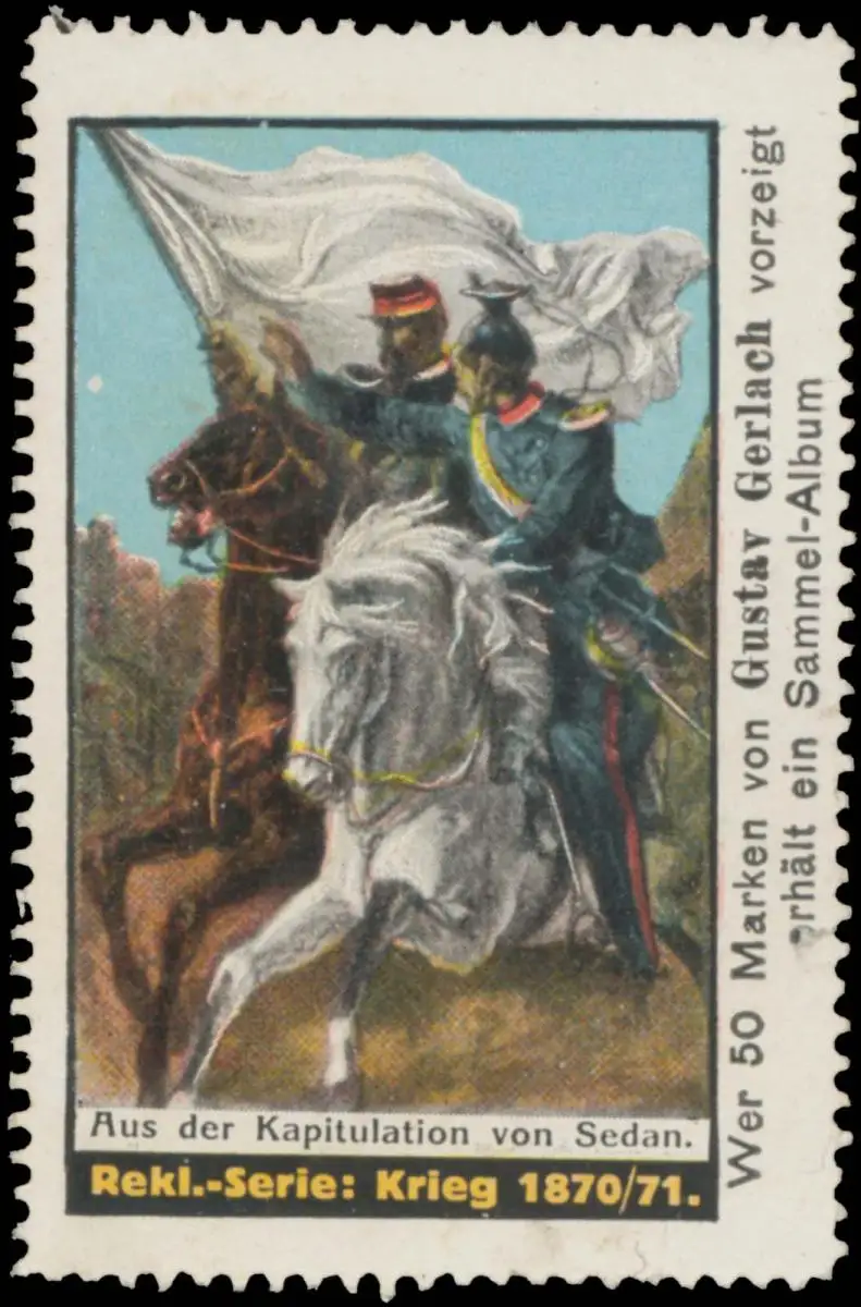 Reklamemarken-Serie: Krieg 1870/71, wer 50 Marken von Gustav Gerlach vorzeigt erhält ein Sammel-Album., Größe/Zustand: 6x4 , guter Zustand, Original alte Reklamemarke die seinerzeit für die Werbung benutzt wurde