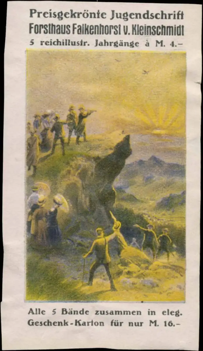 Forsthaus Falkenhorst v. Kleinschmidt, Preisgekrönte Jugendschrift, Jagd, Größe/Zustand: 8x4 , leicht beschädigt, Original alte Reklamemarke die seinerzeit für die Werbung benutzt wurde