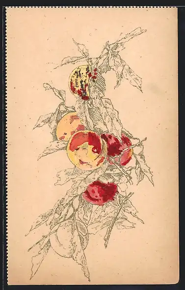 Ausmal-AK Zweig mit reifen Pfirsischen
