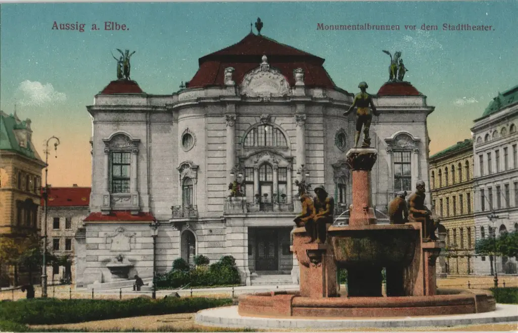 Aussig Ústí nad Labem Monumentalbrunnen vor dem Stadttheater 1918
