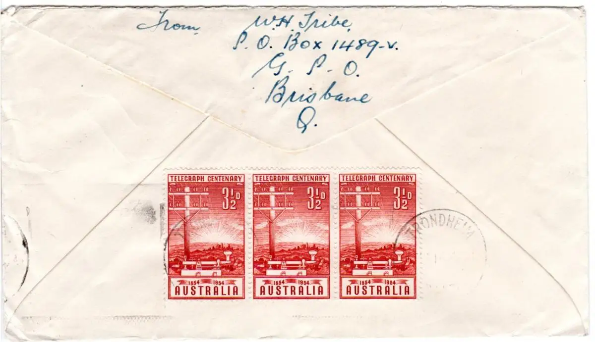 Schöner Ersttagsbrief 7x3 1/2d vorder- u. rückseitig per Luftpost v. Brisbane n. Trondheim.