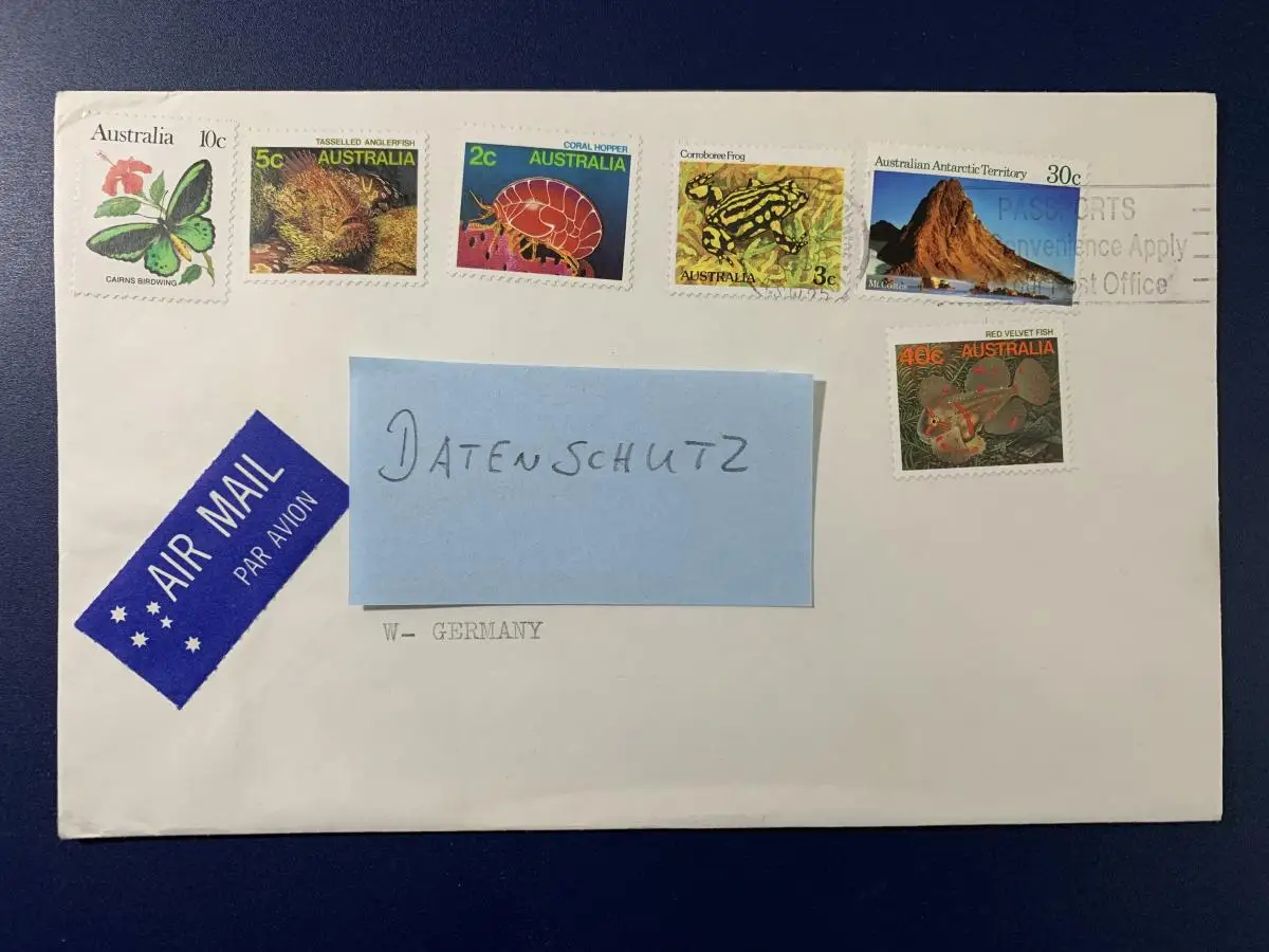 Luftpostbrief von New Lambton Heights, NSW, Australien nach München, Datum des Poststempels ist leider nicht zu erkennen. Von sechs Briefmarken sind lediglich zwei durch den Stempelautomaten entwertet worden. Brief ist sehr gut erhalten, Format 19 x 12 cm.