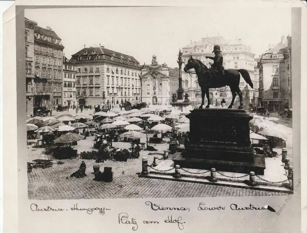 Bemerkungen: Reproduktion aus dem Jahr 1927. Das Denkmal von Feldmarschall Josef Wenzel Radetzky von Radetzky, das im Vordergund zu sehen ist wurde im Jahr 1892 auf dem Platz `Am Hof` platziert bevor es 1912 vor das neu errichtete Kriegsministerium gestellt wurde.