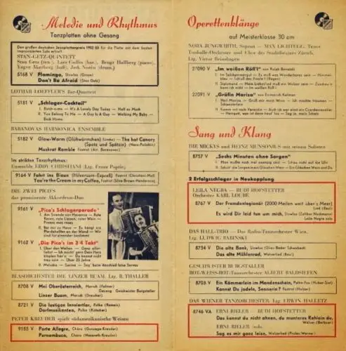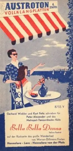 sehr guter Zustand, geringe Gebrauchs- und Alterungsspuren: Papier etwas vergilbt, aber Seiten sauber und ordentlich, herausgegeben im Mai 1953 verzeichnet der Prospekt Tanzplatten ohne Gesang, Austroton-Trümpfe, Von Funk und Film, Operrette, Sang und Klang und Die deutschen Spitzenschlager u. a. mit Stan-Getz-Quintett, Die Zwei Pico's, Erni Bieler, Peter Alexander, Leila Negra, Geschwister Burgstaller u. a, Papier, ca. 10 x 20,5, 6 Seiten mit 3 Bildern