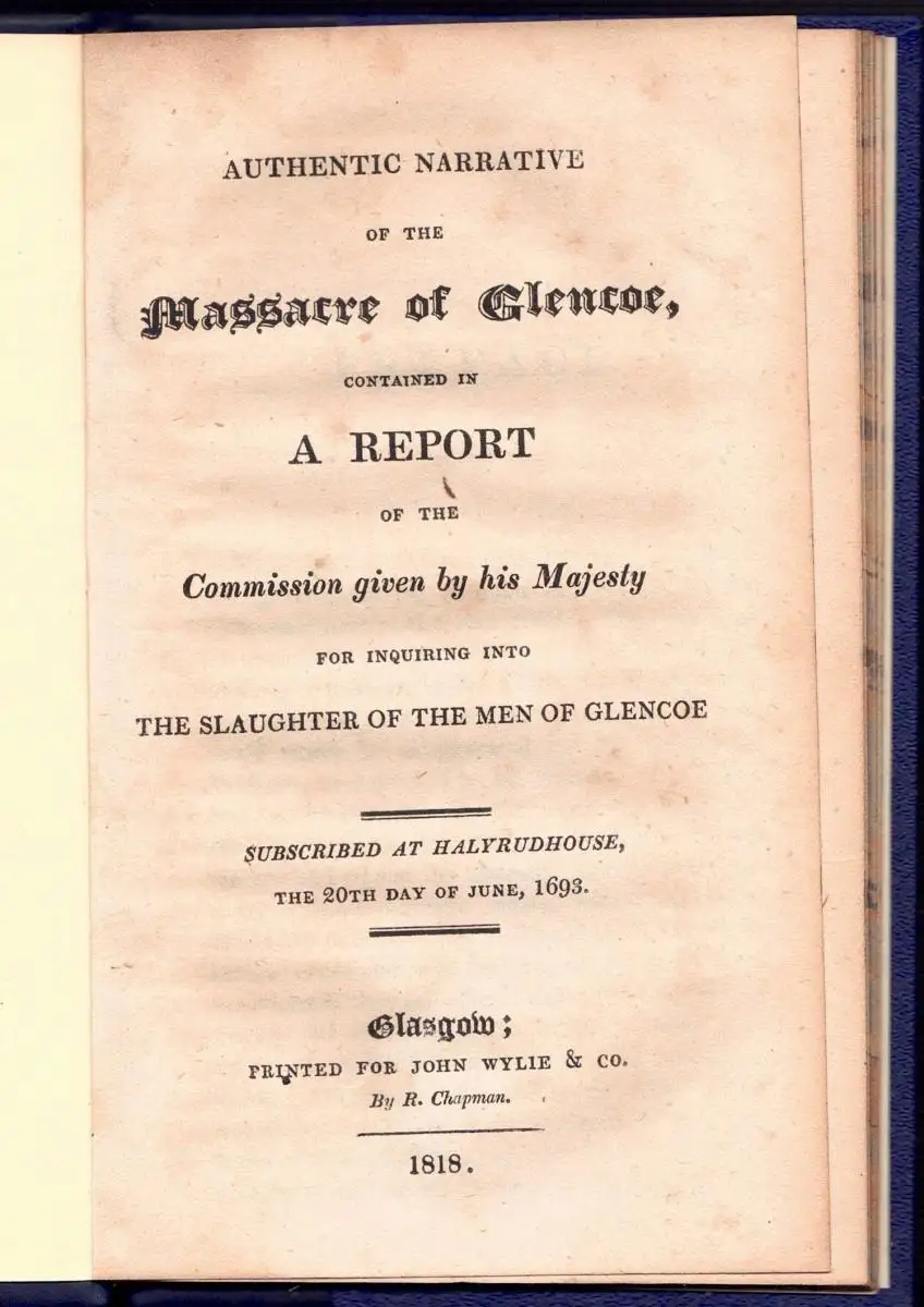 Authentic narrative of the Massacre of Glencoe : contained in a report of the Commission given by his Majesty for inquiring into the slaughter of the men of Glencoe; subscribed at Halyrudhouse, the 20th day of June, 1693.