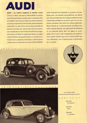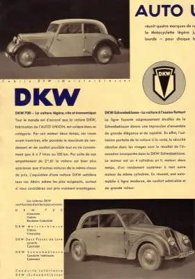 8 Seiten DinA4 Faltblatt DKW 700, Meisterklasse, Schwebeklasse; Wanderer W 250, Audi Front; Horch 830 B und 850 Französischer Text Guter Zustand