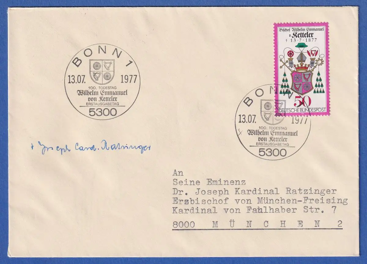 Autogramm JOSEPH KARDINAL RATZINGER auf FDC mit Bund 1977 Ketteler Mi.-Nr. 941