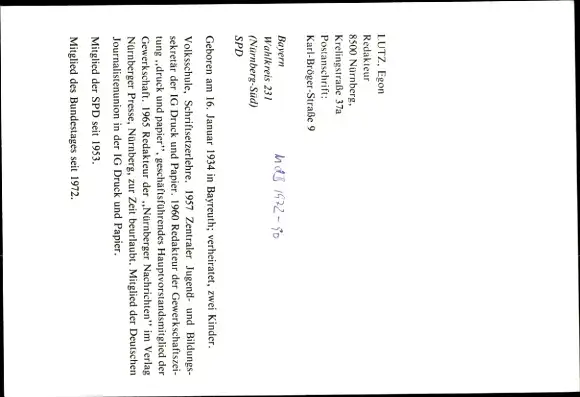 Autogrammkarte Egon Lutz, MdB der SPD, Autogramm