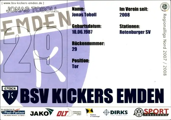 Autogrammkarte Fußballer Jonas Toboll, BSV Kickers Emden, Autogramm