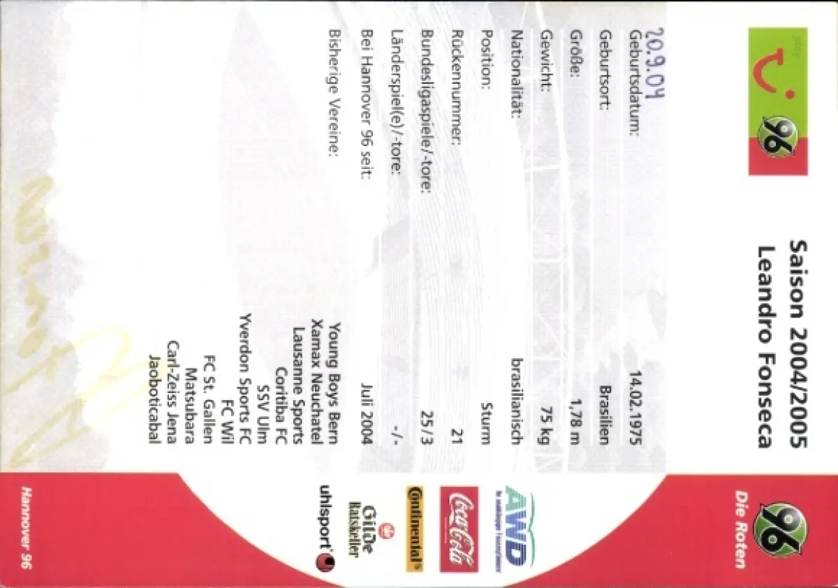 Autogrammkarte Fußballer Leandro Fonseca, Hannover 96, Autogramm