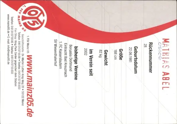 Autogrammkarte Fußballer Mathias Abel, 1. FSV Mainz 05