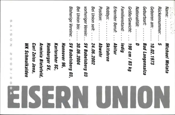Autogrammkarte Fußballer Michael Molata, 1. FC Union Berlin, Autogramm